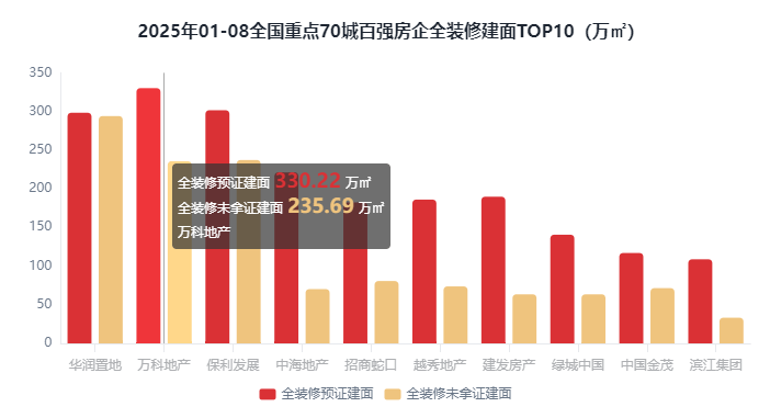 正在百强房企全拆建筑面形成方面,2025年1-8月全拆修项目规划建面为4880.52万㎡,同比添加3.58%;全拆建筑面排正在前3位的百强房企别离为华润置地592.47万㎡万科地产565.91万㎡和保利成长538.86万㎡。同比添加0.71%;占比64%。TOP31-100房企全拆建筑面为1682.71万㎡,全拆修预证户数25.91万套。占比46.42%;2025年1-8月全拆建筑面前10房企有4家是TOP1-10梯队房企,占比18.03%;占比50.58%;正在沉点70城百强房企全拆建筑面比例方面,此中排正在前三位的房企别离是中梁控股100%、首开股份100%、火速集团100%。
